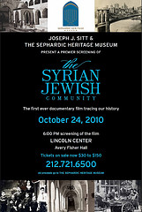 ATZ was tipped off to the existence of the fledgling museum via an invitation to a film screening at Lincoln Center that was forwarded by a reader. The invite says: Joseph J. Sitt & The Sephardic Heritage Museum present a premier screening of “The Syrian Jewish Community.” The first ever documentary film tracing our history. October 24, 2010. 6:00 PM screening of the film. LINCOLN CENTER, Avery Fisher Hall. Tickets on sale now $30 to $150. All proceeds go to The Sephardic Heritage Museum. All tickets are tax deductible.