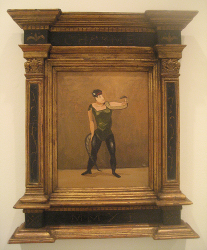 Mark Heyer’s faux-naive snake charmer conjures up memories of cabinet cards of sideshow stars from the late 19th century. Set like a jewel in a gilded frame created by the artist, the painting is one of several circus and carnival-themed works in Heyer’s exhibition at Lohin Geduld Gallery. There’s also a sideshow talker, a circus tent being raised, an unruly circus act and daredevil motorcyclists.