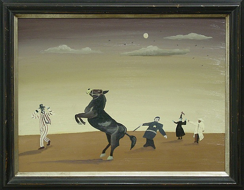 The Unruly is the last of what you ask about. This one in particular I invite the viewer to add to the story, because who is the unruly one? The mule? The clown on the left? Or even someone in the background could have done something to start this event. In the actual photo there is a wagon also, but it wasn’t needed for what I wanted to show. I imagine this photo was staged as part of an act, I don’t really know though. It was a great image from my favorite subject matter and also allows for many different endings to the story. When I first found this photograph, I intended this one to be the image on the card. It was also the first painting that I painted for this show.
