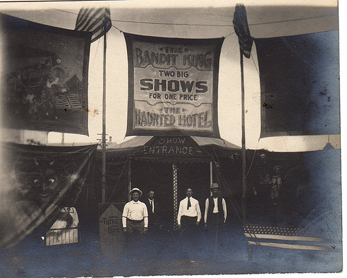 This weekend, a selection of vintage photos of carnival and circus sideshow fronts is up for bid at Slotin Folk Art’s fall auction. Though the photographs are black-and-white or sepia-toned, they convey how the flashy, spirited canvas banners entranced the eye and reverberated in the imagination.