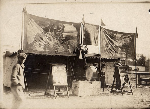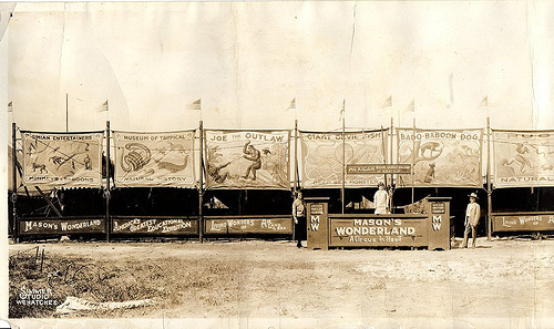 When P.T. Barnum first brought itinerant entertainers together under one roof in his dime museum (which actually cost 25 cents), he had the building’s facade emblazoned with oval paintings and oversized banners. It boosted his ticket sales by $100 a day, or so he claimed. After the turn of the century, hundreds of circus and carnival sideshows toured the country, and long, glorious banner lines advertising a variety of popular entertainments competed with each other to attract customers.