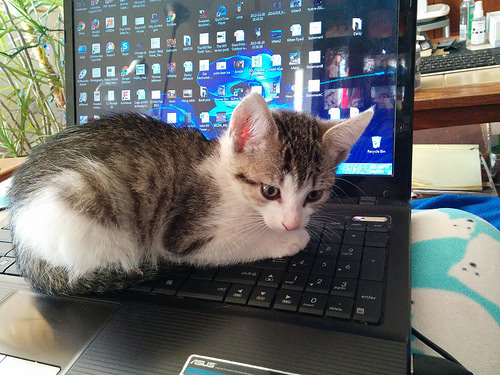 If you’re cat lonely this winter, Yoda will be happy to keep you and your computer company. She is one of four Coney Island kittens born indoors and hand-raised by a cat-loving family that will soon be up for adoption. The kittens, two girls and two boys, are now 11 weeks old and at Sean Casey Animal Rescue. Yoda and Phantom, the black and white kitten, are the girls. Smokey and Tiger are the boys. Now that they’re are old enough to be adopted, our friend Diana brought the foursome to Sean Casey last week. She is keeping two of the kittens and Mama will get spayed.