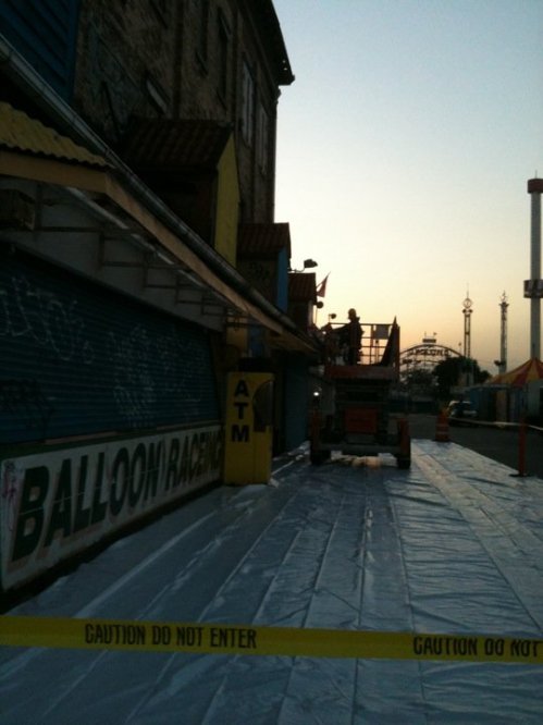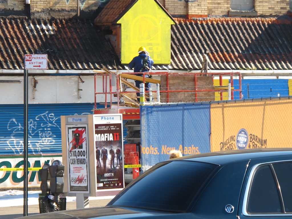 Since photos of Thor’s workers hammering away at the Henderson Building were posted on Monday, Coney Island’s Community Board 13 has questioned the Dept of Buildings (no permits have been issued for demolition) and Dept of Environmental Protection (a permit for asbestos abatement has been issued, though it was not displayed at the worksite). It appears that public scrutiny has led the crew to beef up their asbestos safety procedures. In the first photo, for example, there’s a sheet of material covering the sidewalk, which was not the case on Monday.
