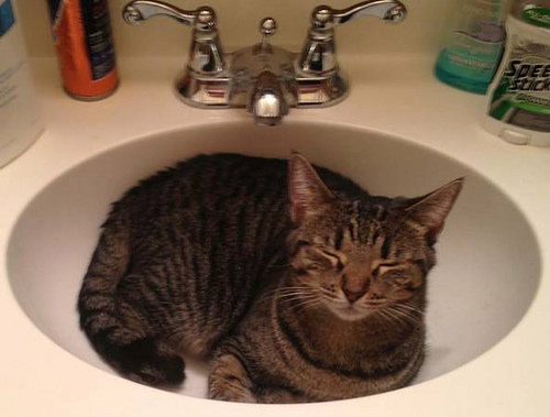 Mona, the cat curled up in the sink, was adopted on Sunday. Carey Gardens Clover found a foster home. Spice and several other cats are still waiting for their forever homes.