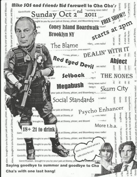 Today, hardcore punk bands will be playing their last live show at Cha Cha’s of Coney Island, which closes forever this month. The scathingly satirical poster by Mike SOS and Friends says it all: Mayor Bloomberg is suited up as a commando with an Uzi. A comic book character of a girl assures her guy: “Soon Coney Island will be a safe place for us!!” The message in the background is “Gentrification brought to you by your pals at Disney, phizer and Bloomberg news radio.”