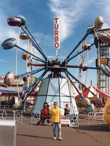 Mark Hackett, co-founder of the Turbo Amusement Ride Fan Club, after riding the Turbo for the first time – 12 times in a row!- at Maple Leaf Village in Niagara Falls, 1991. Photo © Mark Hackett