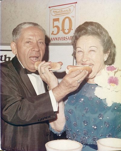 Nathan Handwerker and Ida Handwerker at the 50th anniversary of Nathan’s, 1966. Photo By Daniel Farrell. Courtesy of Loquat Films
