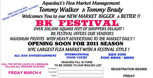 Like it or not, and some Coney Island businesses don’t like it at all, “NYC LARGEST FLEA MARKET WITH A FESTIVAL STYLE! [sic]” is on the verge of getting permits to open Aqueduct’s answer to Thor’s flopped Flea by the Sea in Coney. ATZ learned that Will McCarthy, the event organizer of the “BK Festival,” who already applied for a Temporary Place of Assembly Permit from the DOB, will meet with City officials on Thursday in hopes of speeding along necessary approvals from the FDNY and DEP. Sources say a meeting with the Brooklyn Borough President to discuss the festival’s plans is also on this week’s schedule.
