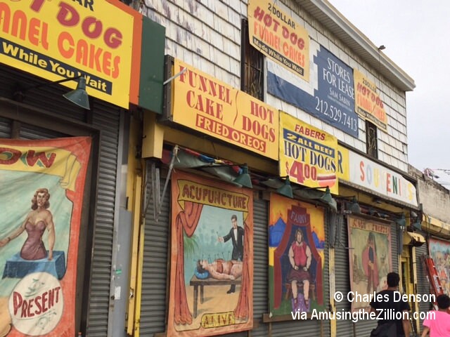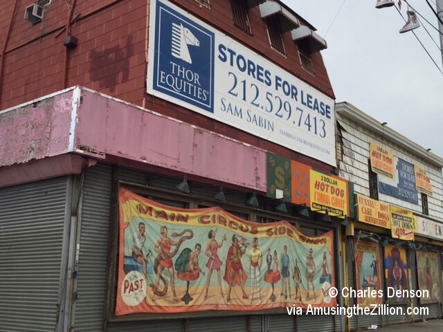 Vintage sideshow banners on Coney Island’s oldest building, owned by Thor Equities. Photo © Charles Denson. August 11, 2015
