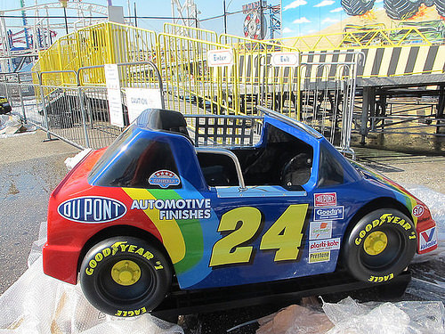 One of NASCAR themed race cars from the Zamperla Speedway ride at Deno’s Wonder Wheel Park. March 2, 2015. Photo via Deno’s Wonder Wheel Park
