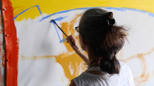 Still from This Side of Dreamland, a documentary portrait of banner painter Marie Roberts by Patrick Reagan and Joshua Glick