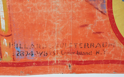 The two banners seen above–Human Freaks and Personality Fat Girl are the work of the Coney Island studio of Millard & Bulsterbaum. The firm’s name and address — 2894 W 8th Street — can be seen in the lower right corner of the banners. “Just one more bolt of cloth will make it,” says a tailor depicted fitting the glamorous fat girl with a new costume. Algernon Millard and John Bulsterbaum, who were in business from 1915 though the Depression, were considered the best in the business.