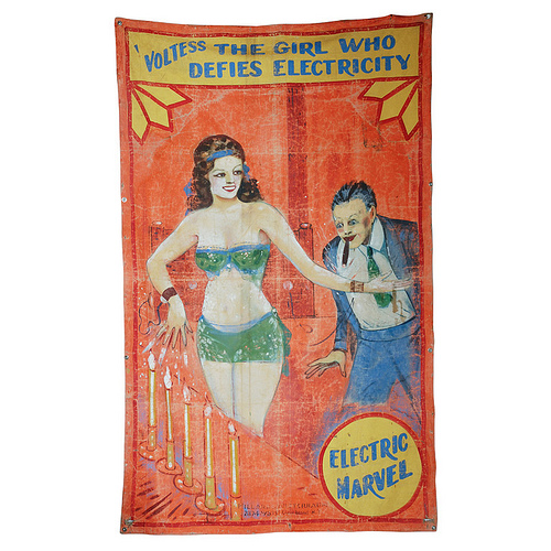 After a sideshow promoter made Zorine, Queen of the Nudists and the Zoro Garden Nudist Colony the sensation of San Diego’s 1935-1936 California Pacific International Exposition, imitators sprang up on carnival and fair midways. This banner for the “Nudist Colony” at a county fair in Ohio asks “Are they ever ashamed?” Shows featuring talkers and inside lecturers dressed as nurses and doctors helped explain the wonders and mysteries of medical science in the days before television and the Internet. Step right up to the College of Hygiene Science!