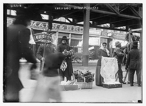 These century-old photos of peddlers hawking holiday cards–one cent each!– teddy bears and ingenious toys on New York City streets, circa 1908-1917, are a window onto Christmases past for street vending. Exchange the clothing and the goods for the 21st century equivalent and they could be on the street today. Or maybe not…