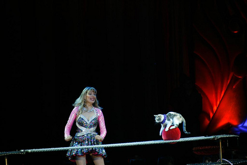 If we were a little girl, we’d want to be Mayya Panfilova when we grow up. Then we would never be cat lonely. According to the Illuscination website, ten of the twelve performing housecats were handpicked and trained by Panfilova, while the other two were born in her care. The cats balance on top of balls, jump through hoops and walk across a low wire using their front paws. Dear Ms. Panfilova, we suggest you write a book: “How to Train Your Cat to Be a Circus Star.” We predict it will be a bestseller!