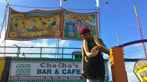 Cha Cha’s stint as a sideshow with a Boardwalk bally was officially over on Saturday night. John Strong’s sideshow can now be found at the 1109 Surf Avenue location near Jones Walk. From the F train on Sunday afternoon, I could see he’d already gathered a crowd. Having the sideshow bally and ticketbox out front at Cha Cha’s drew onlookers, but Cha Cha’s bar lost business. People didn’t realize you could walk past the talker and just have a drink at the bar. Or they’d buy a ticket for the show, but not a drink. Now if you go to Cha Cha’s, there’s live music with a $5 cover which includes one drink.